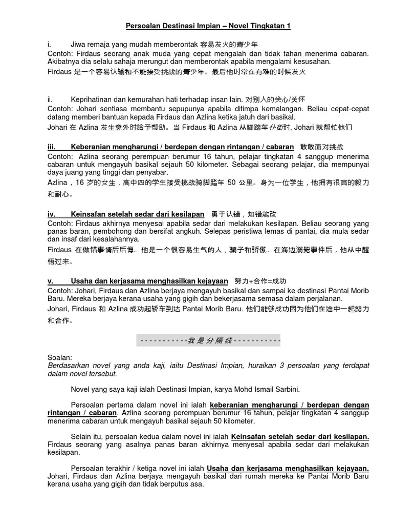 Contoh novel tingkatan 3. Farid menjalankan tugas sebagai pengarah urusan syarikat batik nusantara. Alias merupakan seorang yang bijak dalam mata pelajaran Matematik.